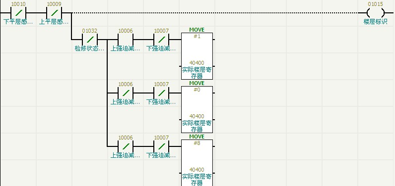 (3)平層檢測和強迫減速模塊:當電梯檢測到上、下平層感應器(10009和10010)的輸入信號時,表明電梯已經進入平層區。當電梯上行轎廂碰到上強迫換速開關(10006)時,上強迫換速開關動作,電梯由快速被強迫換速為慢速,并判斷電梯的實際運行樓層(40400)是否運行到最頂層(#00008);當電梯下行轎廂碰到下強迫換速開關(10007)時,下強迫換速開關動作,電梯由快速被強迫換速為慢速,并判斷電梯是否運行到最底層(#00001)。