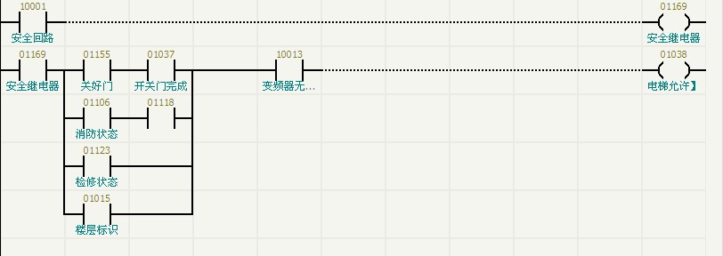 (1)電梯自檢模塊:安全回路中各開關接觸良好,安全回路信號(10001)輸入,安全繼電器(01169)閉合。當電梯開關門完成(01037),關門到位(01155)輸出為ON,且處于非強制狀態時,如果變頻器無故障輸入(10013),則電梯允許(01038)正常運行。