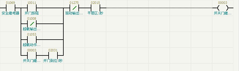(2)電梯開關門模塊: 安全繼電器(01069)線圈接通時,有開門信號(10011)或有安全觸板動作脈沖輸入,在進入平層區1秒(02015)后,驅動門機開門,開門繼電器接通;在開門到位信號(10012)或開門到位5秒后,關門繼電器輸出