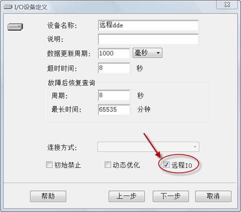 數據服務器端也需要定義設備和組點連接,就好像是數據服務器就在目標機器上一樣。不過在定義設備的時候需要指明遠程IO項,如下圖所示。