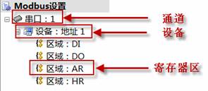 當(dāng)增加了一個(gè)設(shè)備之后,該設(shè)備就自動(dòng)地?fù)碛辛?個(gè)區(qū)域,分別是DI、DO、AR、HR區(qū)域。它們和Modbus命令的對(duì)應(yīng)關(guān)系如下表所示: