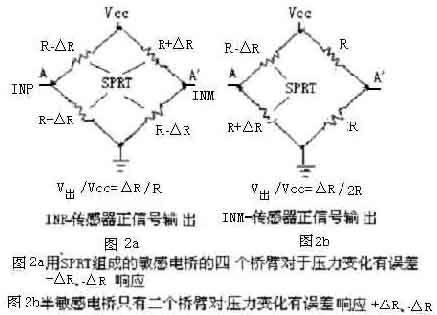 硅壓阻式傳感器一般配置為一個(gè)緊密的惠斯登電橋。當(dāng)有壓力施加到SPRT的敏感電橋的橋臂時(shí)(見(jiàn)圖2a所示),對(duì)角橋臂的電阻值R將發(fā)生相同方向、相同大小的改變,即R+△R和R-△R。當(dāng)一個(gè)對(duì)角橋臂上的兩個(gè)電阻值在壓力的作用下增加時(shí),另外一個(gè)對(duì)角橋臂的電阻值降低,反之亦然。對(duì)于SPRT半敏感電橋(見(jiàn)圖2b所示),則只有半邊橋臂的電阻值發(fā)生改變。不管是全橋還是半敏感電橋的傳感器都具有高靈敏度(>10mv/v)、良好的線性、溫度穩(wěn)定性及無(wú)信號(hào)滯回等優(yōu)點(diǎn),其測(cè)量范圍可上至破壞性極限。
