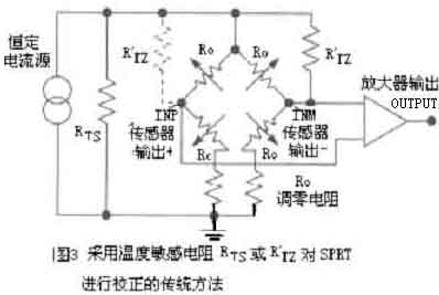 由于橋路電壓隨溫度而上升,這種溫度相關(guān)性可以用來(lái)補(bǔ)償滿偏輸出(FSO-Fullspanoutput)的溫度誤差。對(duì)于恒流源激勵(lì)電橋,滿偏輸出(FSO)隨著溫度上升而下降,造成了滿偏輸出的溫度相關(guān)誤差(FSOTC)。然而,如果使橋路電壓隨著溫度以一定的速率上升,恰好補(bǔ)償?shù)魸M偏靈敏度隨溫度的下降,則滿偏輸出(FSO)將保持恒定。