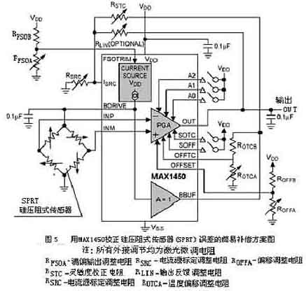 因MAX1450采用比MAX1457少得多的校準(zhǔn)點(diǎn),其精度為1%。通常被用于混合方案,該方案將MAX1450和激光微調(diào)電阻(圖5所示的外接微調(diào)電阻)相結(jié)合提供了一種低成本的解決方案,即用MAX1450信號(hào)調(diào)理器配合外部激光微調(diào)電阻可提供1%精度。調(diào)整圖5中的RFSOA微調(diào)電阻用來(lái)設(shè)定初始(FSO)靈敏度,而失調(diào)溫度漂移(OFFSETTC)的補(bǔ)償是通過(guò)ROFFA和ROTCA微調(diào)電阻的調(diào)整來(lái)實(shí)現(xiàn)。