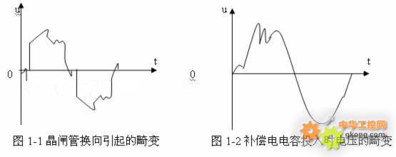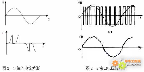 1、 變頻器所受的外部干擾 1) 晶體管換流設備對變頻器的干擾: 當供電網絡內有容量較大的晶閘管換流設備時,由于晶閘管總是在每相半周期內的部分時間導通,容易使網絡電壓出現凹凸(如圖1-1所示)。它使變頻器輸入側的整流電路有可能因此出現較大的反向回復電壓而受到損害。 2) 補償電容器的投入和切出對變頻器的干擾: 當在供電線路的變電所內采用集中電容補償的方法來提高功率因數時,在補償電容投入和切出的暫態過程中,網絡電壓有可能出現很高的峰值(如圖1-2所示)。其結果是可能使變頻器的整流二極管內承受過高的反向電壓而擊穿。 2、 變頻器對外部的干擾 1) 變頻器電流波形:變頻器的輸入電流和輸出電流中,都具有較強的高次諧波成分,它們將對其它控制設備形成干擾,影響其它設備的正常工作。  輸入電流的波形: 如“交-直-交”電壓型變頻器的輸入側是整流和濾波電路(如圖示2-2所示),只有電源的線電壓U2大于電容兩端的電壓UD時,整流橋中有充電電流。充電電流