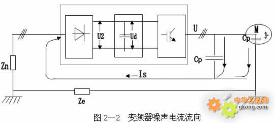 輸出電壓與電流的波形: 絕大多數變頻器的逆變橋都采用PWM調制方式(如圖2—2),其輸出電壓為占空比按正弦規律分布的系列矩形波(如圖2-3所示)。 寄生電容Cp存在于電機電纜和電機內部,因此變頻器的PWM輸出電壓波形的開關翼部通過寄生電容產生一個高頻脈沖電流Is,使變頻器成為一個諧波干擾源。由于諧波電流Is的產生源是變頻器,因此它一定要流回變頻器。圖中Ze為 大地阻抗,Zn為動力電纜與地之間的阻抗。諧波電流流過此二阻抗所造成的電壓降,將影響到同一電網上的其它設備造成干擾。