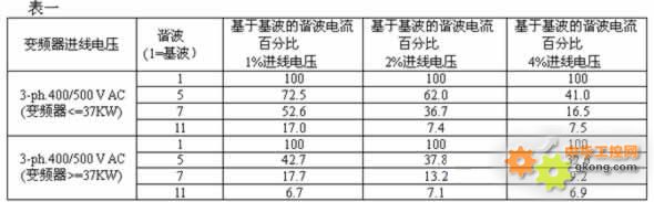 總是出現在電源電壓的振幅值附近,呈不連續的沖擊波形式(如圖2-1所示)。它具有很高的奇次諧波成份,特別是5次和7次諧波,如表一(以西門子MM3變頻器為例)。
