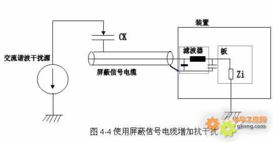  屏蔽信號電纜增加抗干擾(如圖4-4所示): 當變頻器作為被干擾對象時,高次諧波干擾電流Is可以通過電勢和耦合電容進入變頻器并且在阻抗Zi上產生一個壓降,導致噪聲干擾。為此最有效的方法是嚴格隔離高頻干擾和信號電纜,并且信號電纜屏蔽一定要在兩端接地。  控制電纜最好使用屏蔽電纜。一般來說,控制電纜的屏蔽層應直接在變頻器的內部接地,另一側通過一個高頻小電容(例如3.3nf/3000V)接地。當屏蔽層兩端的差模電壓不高和連接到同一地線上時,也可以將屏蔽層的兩端直接接地。信號線和它的返回線絞在一起,減小感性耦合引起的干擾。絞合越靠近端子越好。模擬信號的傳輸線應使用雙屏蔽的雙絞線。不同的模擬信號線應該獨立走線,有各自的屏蔽層,以減少線間的耦合。不要把不同的模擬信號置于同一個公共反回線。低壓數字信號最好使用雙屏蔽的雙絞線,也可以使用單屏蔽的雙絞線。  良好的接地及合理的布線:確保柜體中的所有設備接地良好,使用短和粗的接地線連接到公共接地點或接地母排上。特別重要的是,連接到變頻器的任何控制設備要與其共地,同樣也要用短和粗的導線接地。最好采用扁平導體(如金屬網),因其在高頻時阻抗較低。 合理布線也是很重要,模擬信號和數字信號的傳輸電纜應該分別走線。盡量不要將低壓線與220VAC電源線共用同一電纜。應盡量避免電機電纜與其它電纜長距離平行走線。 設計控制柜體時要注意EMC的區域原則,盡量把不同的設備規劃在不同的區域中。