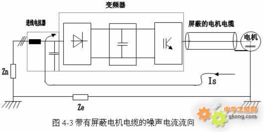 3)、使用屏蔽電纜及合理布線: 對通過感應方式傳播的干擾信號可通過下列方式予以消除。  使用屏蔽電機電纜:對于高頻干擾,如果高次諧波干擾電流Is有一條合理的通道,則高頻干擾是可以得到抑制的。如果使用非屏蔽電纜,則高次干擾諧波電流Is以一個不確定的路線流回變頻器,并在此回路中產生高頻分量壓降,影響干擾其它設備。為使高次諧波干擾電流Is能沿確定路線流回變頻器,需要采用屏蔽電機電纜(如圖4-3所示)。電纜屏蔽層必須連接到變頻器外殼和電機外殼上,當高次諧波干擾電流Is必須回變頻器時,屏蔽層形成一條有效的通道。這樣,高次諧波干擾電流就不會在Ze上產生壓降,在Zn上的壓降可由進線電抗干擾濾波器來抑制(如圖4-2中的F12)。