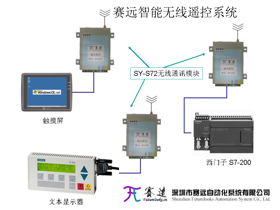 賽遠推出的系列產品,如SY-S72,直接采用PPI協議,將PLC和支持該協議的各種人機界面能夠通過無線的方式直接連接,從而達到遙控器的豐富的可編程功能。人機界面可以采用文本顯示器,觸摸屏或者按鈕型的顯示器,如西門子的TD200,TP177,MP277,威綸的MT8000系列等顯示屏,功能強大,完全可以直觀的顯示和進行無線控制。而控制器端因為是可編程控制器,可以實現十分豐富的功能,所以控制方法和無線遙控結合,可以實現很多負責的功能。
