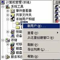 打開“控制面板”,選擇“管理工具”中的“計(jì)算機(jī)管理”,在導(dǎo)航樹中選擇“系統(tǒng)工具”下的“本地用戶和組”,展開后在其中的“用戶”上點(diǎn)擊鼠標(biāo)右鍵選擇“新建用戶”,如下圖: