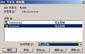 以上操作完成之后,點(diǎn)擊右下方的“權(quán)限”按鈕,打開“DDE共享名的權(quán)限”對(duì)話框。如下圖: