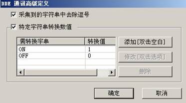 其中,采集到的字符串中去除逗號(hào)主要是針對(duì)有些DDE服務(wù)器的某些特性設(shè)置的,比如1234某些DDE服務(wù)器會(huì)傳遞1,234此時(shí)應(yīng)該把逗號(hào)去除方能采集到正確的數(shù)據(jù)。特定字符串轉(zhuǎn)換數(shù)值主要是為了把采集到的特定字符串轉(zhuǎn)換為特定值時(shí)使用。比如,把ON或Open轉(zhuǎn)換為1,把OFF或Close轉(zhuǎn)換為0,注意此處的字符串是不區(qū)分大小寫的。