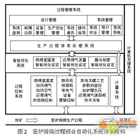 3 豎爐焙燒過程綜合自動化系統 結合選礦廠豎爐焙燒過程的特點,采用智能優化、過程控制和過程管理三層結構的綜合自動化系統體系架構,提出了如圖2所示豎爐焙燒過程綜合自動化系統。