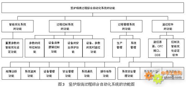 3.2 系統功能 豎爐焙燒生產過程綜合自動化系統包括:智能優化系統、過程控制系統和過程管理系統(系統功能圖參見圖3)。豎爐智能優化系統根據生產指標要求,根據選礦廠制定的指標:磁選管回收率,由回路智能優化設定模型對豎爐焙燒過程的燃燒室溫度、還原煤氣流量和搬出制度等控制回路的給定值進行優化設定,實現焙燒過程的磁選管回收率優化控制,從而保證選礦過程綜合生產指標的優化。