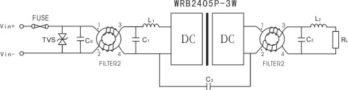 電路中的一些共模干擾,我們可以考慮在模塊的輸入端采用共模扼流圈FILTER2進(jìn)行抑制(MORNSUN公司有此配套產(chǎn)品),如圖2所示。