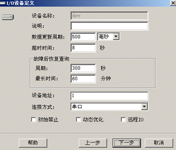 設(shè)備名稱:該I/O設(shè)備的名稱,通過(guò)它,可以組態(tài)數(shù)據(jù)連接等。 數(shù)據(jù)更新周期:數(shù)據(jù)多長(zhǎng)時(shí)間更新一次。實(shí)際的更新周期取決于設(shè)備和計(jì)算機(jī)通訊的速度,有可能大于該周期,但是最小不會(huì)小于該周期。 超時(shí)時(shí)間:當(dāng)與設(shè)備進(jìn)行通訊時(shí),如果超過(guò)超時(shí)時(shí)間沒(méi)有應(yīng)答,則該次數(shù)據(jù)通訊的數(shù)據(jù)作廢,又開(kāi)始下一次數(shù)據(jù)通訊。如果一個(gè)設(shè)備連續(xù)超時(shí)3次,則認(rèn)為該設(shè)備進(jìn)入到故障狀態(tài)。 故障后恢復(fù)查詢/周期:當(dāng)設(shè)備發(fā)生故障后,為了提供通訊速度,不能按正常的調(diào)度時(shí)間進(jìn)行調(diào)度,該周期是每隔多長(zhǎng)時(shí)間查詢一次設(shè)備,看其是否從故障狀態(tài)中恢復(fù)。 故障后恢復(fù)查詢/最長(zhǎng)時(shí)間:當(dāng)設(shè)備發(fā)生故障后,如果在最長(zhǎng)時(shí)間內(nèi)不能恢復(fù)正常,則以后不再查詢其狀態(tài),即使其已經(jīng)恢復(fù)正常。 設(shè)備地址:PLC設(shè)備的地址。