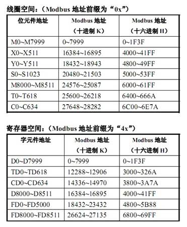 元件類型:支持的物理設(shè)備元件;可編程控制器內(nèi)部軟元件編號(hào)與對(duì)應(yīng)的 Modbus地址編號(hào)入下表示: