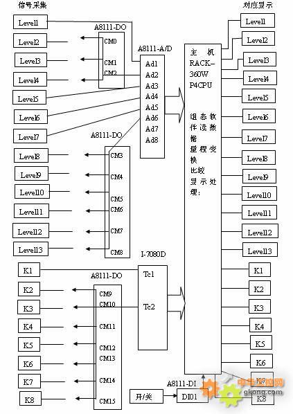 首先考慮測試系統的一是價格要低,二是可用性要強。將電路板的信號源做了一些處理,信號輸出范圍變成標準信號輸出。被測電路板的信號輸出情況,電壓信號有13路其中3路5V電壓6路26V電壓相同,頻率信號有8路其中7路的頻率相同。采集部分采用一塊8通道12位30KS/S ISA多功能卡A8111和一塊2通道的I-7080D計數模塊來完成信號采集功能。充分利用A8111上的16路數字輸出繼電器的開關功能,讓Ad2、Ad6、Tc2三個通道通過輸出繼電器的開關輪流接通Level2-4、Level8-13、K2-8。