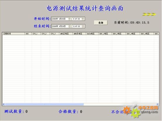 當系統完成一塊電路板的測試后,將被測電路板的所有數據保存起來,方便以后查詢統計。我們可以根據時間來查詢,在畫面中輸入開始時間和結束時間(年、月、日、時、分),系統會將這段時間測試情況顯示出來,測試總數、合格數量、不合格數量,每塊已測電路板的所有參數數據全部統計出來。如下圖: