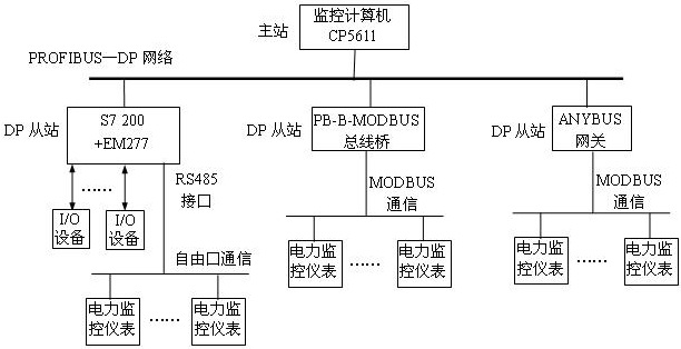 1 系統(tǒng)構(gòu)成 本系統(tǒng)采用安裝了CP5611通信板卡的工控機(jī)作為通信主站,S7-200 PLC CPU222、ANYBUS網(wǎng)關(guān)、PB-B-MODBUS總線橋分別作為PROFIBUS-DP網(wǎng)絡(luò)的三個(gè)從站,每個(gè)從站又與電力監(jiān)控儀表組成一個(gè)子網(wǎng),如圖1所示。系統(tǒng)中同時(shí)也可以連接其他的PROFIBUS-DP從站設(shè)備。