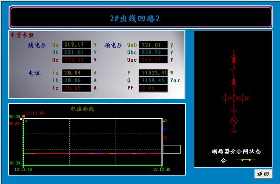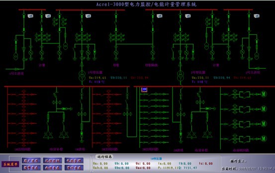 2 系統(tǒng)功能 基于PROFIBUS-DP的電能管理與電力監(jiān)控系統(tǒng),上位機(jī)軟件為ACREL-3000電力監(jiān)控組態(tài)軟件。通過該軟件進(jìn)行組態(tài),可以在上位機(jī)界面上實(shí)現(xiàn)隊(duì)所有電參量的實(shí)時(shí)顯示,如I、U、P、Q、kWh等,圖4所示為本系統(tǒng)的電能管理及電力監(jiān)控系統(tǒng)主界面。
