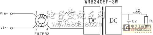 方案一 共模干擾電路中的一些共模干擾,我們可以考慮在模塊的輸入端采用共模扼流圈FILTER2進行抑制(MORNSUN公司有此配套產品),如圖2所示。