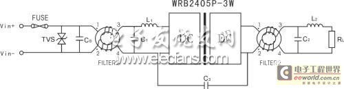 輸入端有時還存在有高電壓脈沖沖擊的可能,以及對干擾較強或EMC要求較嚴格的電路,應考慮在輸入端加上自恢復FUSE及TVS管進行一級防護,使得有效地將過高的脈沖干擾電壓鉗制在模塊可承受值范圍之內,并在輸出端也增加共模扼流圈FILTER2或安規電容。如圖3示:
