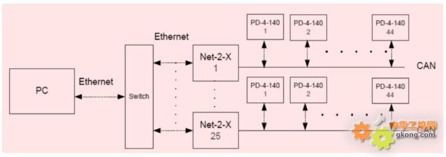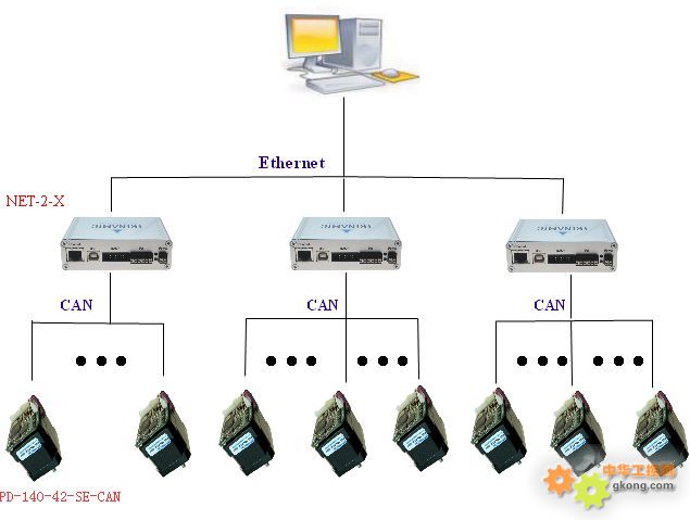整個網路結構十分清晰,主要有Ethernet轉CAN的NET-2-X和PD-140-42-SE-CAN(支持 CAN總線的控制+驅動+電機+反饋)現分別介紹PD-140-42和NET-2-X。 |