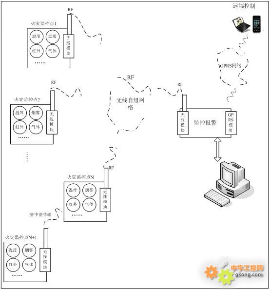 監控報警設備上集成有無線模塊,可以無線接收溫度報警點上發送過來的信息,并通過GPRS傳送至遠端控制設備,遠端控制設備可以是PC或PDA等;當然,監控報警設備也可以通過USB直接與PC連接。
