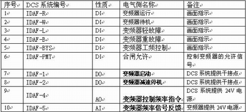 圖1:單元串聯多電平高壓變頻器原理框圖 3.2 高壓變頻器與現場接口方案 北京利德華福電氣技術有限公司的高壓變頻器的控制部分由高速單片機、人機界面和PLC共同構成。單片機實現PWM控制和功率單元的保護。人機界面提供友好的全中文監(jiān)控界面,同時可以實現遠程監(jiān)控和網絡化控制。內置PLC用于柜體內開關信號的邏輯處理,可以和用戶現場靈活接口,滿足用戶的特殊需要。該高壓變頻器使用西門子S7-200系列PLC,具有較好的與DCS系統(tǒng)接口能力,根據風機的特性運行要求以及高壓變頻器控制的具體要求采取了相應控制方案。 1)DCS系統(tǒng)與高壓變頻器的接口方案 DCS系統(tǒng)與高壓變頻器之間的信號總共有10個,其中開關量信號8個,模擬量信號有2個。(以#1引風機為例)