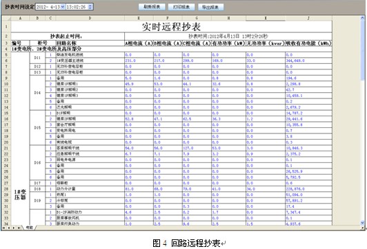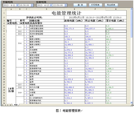 系統采集的有功電度數據,按照回路名稱的不同,自動生成日報表、月報表和年報表并有報表打印功能,并可對某一回路的某一時間段內的用電量進行查詢與打印,同時這些報表也能以Excel的格式導出。如圖5所示。
