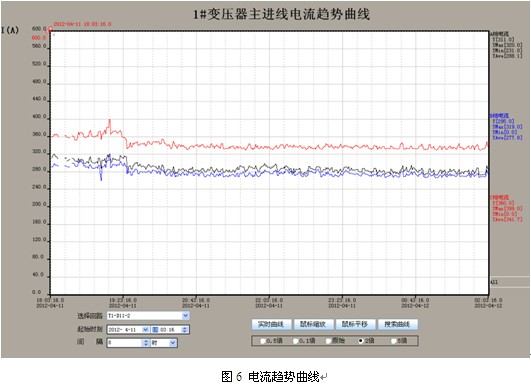 本系統對于重要回路,不僅可以對電流進行實時顯示與監測,并可以根據保存的歷史數據做成趨勢曲線,可以查看實時和歷史變化趨勢,預測電力負荷容量,并可對電力故障進行查詢,保證電力負荷的安全運行。如圖6所示。