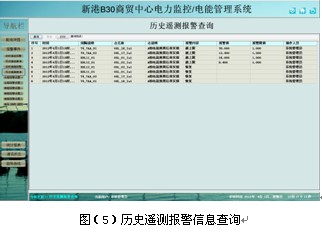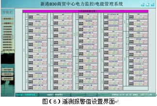 遙信和遙測報警功能,主要完成對低壓各出線回路的開關運行狀態和負載進線監控,對開關變位和負載越限彈出報警界面指示具體的報警位置并聲音報警,提醒值班人員及時處理。遙測報警值設置界面可以看到每個監控點的實時值和報警設置值,方便值班人員比對進線設置,負載越限值在相應權限下可自由設置。具備歷史查詢功能。見圖(4)至圖(6)。