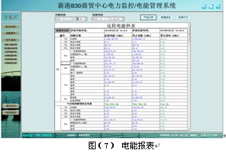 用電量報表功能,可選擇時間段進行查詢,支持任意時間段電度累計查詢,具備數據導出和報表打印等功能。為用戶提供了精確可靠的電能報表。如下圖所示,顯示美羅商城某段時間內的各配電回路的精確用電量,用戶可以直接打印報表,可以以EXCEL格式另存到其他位置。見圖(7)。