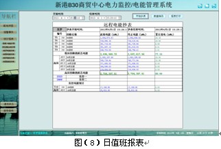 日值班報表功能,可選擇時間段進行查詢,支持任意時間段電度累計查詢,具備數據導出和報表打印等功能。為值班人員每日值班提供了精確可靠的電能報表。如下圖所示,顯示美羅商城高壓出線和低壓總進線的精確用電量,還可以人工添加其他信息,用戶可以直接打印報表。見圖(8)。