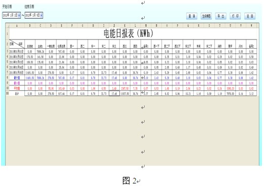 對信號采集系統(tǒng)所采集實時數(shù)據(jù)進(jìn)行統(tǒng)計、分析、計算,將數(shù)據(jù)進(jìn)行定時存儲。并通過計算產(chǎn)生每日/周/月/年用電量;每日/周/月/年最大負(fù)荷及最大負(fù)荷出現(xiàn)時間,對存在故障隱患的設(shè)備及時提出整改;通過電能分時計量累計電費,對不合理用電單位提出科學(xué)合理的改進(jìn);通過邏輯運算計算出設(shè)備正常、異常出現(xiàn)次數(shù),存儲事故發(fā)生時間、原因。電能報表如圖2所示: