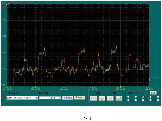 負(fù)荷趨勢曲線提供了某一段時間內(nèi)該回路的負(fù)荷趨勢,方便管理員掌握用電設(shè)備的運行狀況,對存在故障隱患的設(shè)備及時提出整改,對不合理用電單位提出科學(xué)合理的改進(jìn)。如圖4所示: