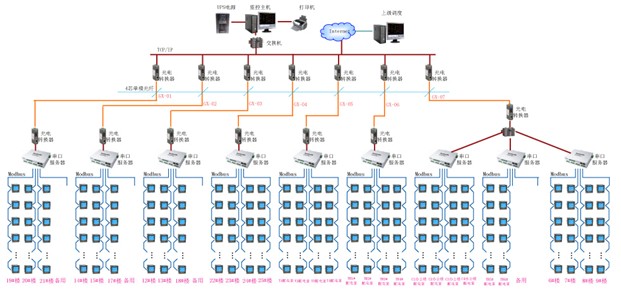 對上海金陵金橋工業園區管理方提出的需求和我們確定的組網方案,站控管理層設備層采購華北工控的工業主機,三星19寸顯示器,SANTAK的UPS;網絡通訊層使用MOXA的NPORT5630-8串口服務器和MS1102的光電轉換器以及3C16470的網絡交換機;現場設備層采用安科瑞公司PZ96-E4系列網絡電力儀表,總線鋪設屏蔽雙絞線,以滿足系統組網的要求。