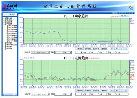 5.3趨勢曲線:功率實時趨勢顯示及歷史趨勢查詢功能。選擇回路后,該回路實時趨勢曲線會不斷刷新,選擇“起始時間”可查看該回路歷史趨勢曲線,選擇“時間長度”可查看歷史日、月、年趨勢曲線,能更加直觀反映該回路運行情況。