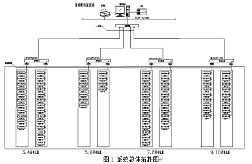 本電能管理系統主要實現惠氏公司四個變電所的0.4kV配電系統的用電監測與電能管理;監測范圍為四個變電所的T1、T2、T3、T4、T5、T6、T7、T8變壓器的低壓進線柜、聯絡柜、饋線柜中的智能電力儀表,從而實現遠程實時監測和電能管理。該系統總計有79只儀表(其中包括8只ACR330ELH諧波儀表,71只PZ系列智能儀表),分8條總線,由于四個變電所之間距離較遠,并且較為分散,采用每個變電所內自行組網,然后并入惠氏公司內部局域網的方式,實該現場總線上儀表與監控主機的數據連通。