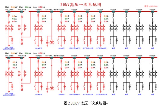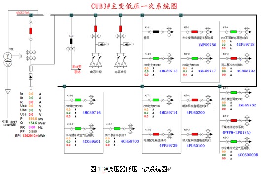 系統具有友好的人機界面,便于普通的現場值班人員查看并記錄相關信息,系統一次圖(如圖2、圖3)不僅顯示了線路的開關狀態,還實時顯示電壓、電力、有功電度等重要的電力參數。所有數據信息都定期的保存到數據庫中。
