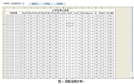 系統對所有采集到的數據都能實時的顯示,并保存到數據庫中,因此可以手動查詢每個回路的所有實時及歷史電參量數據,并以表格的形式展現給用戶,便于打印、保存。如圖4所示。
