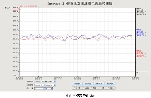 本系統對于重要回路,不僅可以對電流進行實時顯示與監測,并可以根據保存的歷史數據做成趨勢曲線,可以查看實時和歷史變化趨勢,預測電力負荷容量,并可對電力故障進行查詢,保證電力負荷的安全運行。如圖6所示。