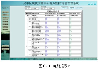 用電量報表功能,可選擇時間段進行查詢,支持任意時間段電度累計查詢,具備數據導出和報表打印等功能。為值班人員提供了精確可靠的電能報表。該報表各回路名稱和數據庫關聯,方便用戶修改回路名稱。如下圖所示,顯示健身中心某段時間內的各配電回路的精確用電量,用戶可以直接打印報表,可以以EXCEL格式另存到其他位置。見圖(7)。