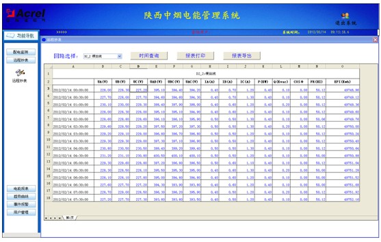 4.2. 遠程抄表查詢:各個配電室各個回路按照時間段進行歷史數據查詢。選擇回路后,可選擇時間間隔、時間長度對該回路進行歷史數據精確查詢,包括電壓、電流、功率、功率因數和電能等常用數據。查詢結果可導出成EXCEL表格進行保存,也可打印保存