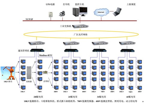 本項目四個分變內10kV配電室監控的設備為碼頭的橋吊、斗輪堆料機、斗輪取料機等大型設備;700V配電室監控的設備為變頻器;400V配電室監控的設備為廠區照明用電、皮帶機、維修設備等。數目都少于10個,所以12個子配電室現場只需各鋪設一根總線即可,該總線將智能電測儀表以菊花鏈的方式連接起來,然后引致各分變的網絡配置室即可。四個分變的四個網絡配置室各配有一個8口的通訊服務器和 一個思科的光端機,配置完成之后將采集上來的數據傳至辦公大樓八樓計算機房內的系統后臺監控主機。本項目的遠程抄表及電能管理系統后臺設有高性能工業計算機、顯示器、UPS電源、打印機、報警蜂鳴器等設備。監控系統安裝在計算機上,集中采集顯示現場設備運行狀況,以人機交互的形式顯示給用戶,同時用戶可以通過系統軟件發送指令至現場設備,實現遠程遙控功能。