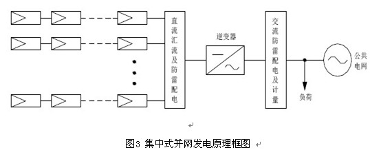 這種并網方式適合于在建筑物上安裝朝向相同且規格相同的光伏陣列,在電氣設計時,采用單臺逆變器集中并網發電方案實現聯網功能,如圖3所示。