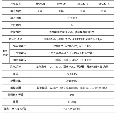 2.2.1 APV-M系列智能光伏匯流箱 在光伏發電系統中,數量龐大的光伏電池組件進行串并組合達到需要的電壓電流值,以使發電效率達到最佳。APV-M系列智能光伏匯流箱主要作用就是對光伏電池陣列的輸入進行一級匯流,用于減少光電池陣列接入到逆變器的連線,優化系統結構,提高可靠性和可維護性。在提供匯流防雷功能的同時,還監測了光電池板運行狀態,匯流后電流、電壓、功率,防雷器狀態、直流斷路器狀態采集,繼電器接點輸出等功能,并帶有風速、溫度、輻照儀等傳感器接口功能供客戶選擇,裝置標配有RS485接口,可以把測量和采集到的數據上傳到監控系統。