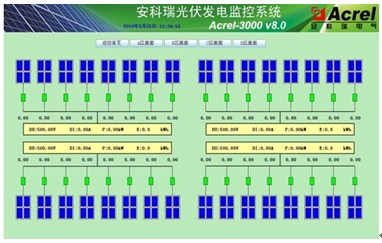 太陽能光伏電站主要由光伏電池陣列、匯流箱、低壓直流柜、逆變柜、交流低壓柜、升壓變壓器等組成,最后產生的高壓交流直接并入電網。針對每個環節電力參數檢測的需要,安科瑞公司推出了AGF系列光伏匯流采集裝置、PZ系列直流檢測儀表及ACR系列電力質量分析儀,分別應用于匯流箱、直流柜及交流柜中,并通過Acrel-2000 V8.0光伏發電監測系統實現后臺集中監控。